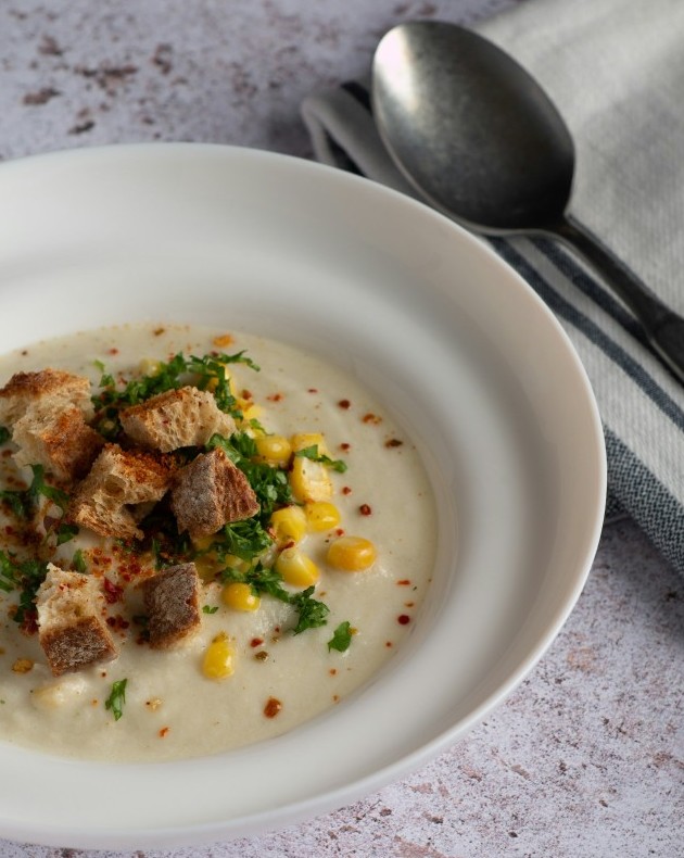 Подавать с кукурузными зернами и щепоткой паприки сверху.