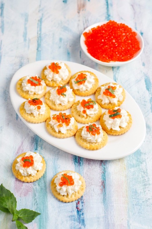 Готовую веганскую икру выложить на крем-сыр в тарталетки. Можно украсить веточками зелени.