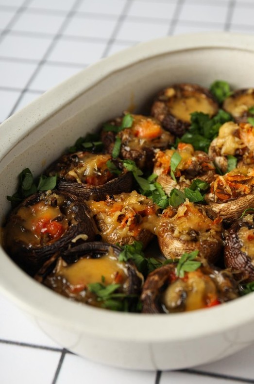 Баклажаны разрезать вдоль, мякоть аккуратно вынуть, измельчить. Обжарить лук и чеснок до мягкости, добавить грибы и мякоть баклажана. Вмешать орехи, томатную пасту, специи. Наполнить лодочки начинкой, посыпать веганским сыром и запекать при 180 °C около 30 минут. Блюдо получается насыщенным, с текстурой и ярким вкусом – идеально для праздничного стола.