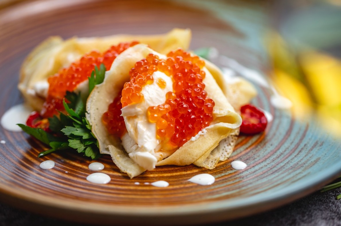 Блины с икрой и сметанным муссом