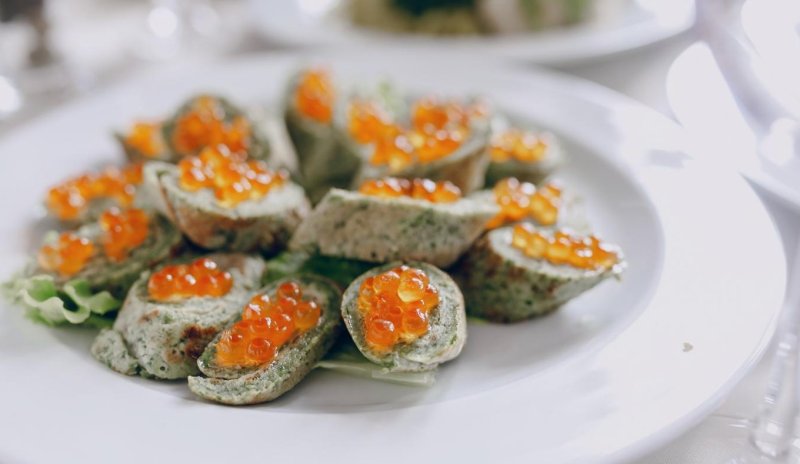 На блин выкладывают ложку сметанного мусса, добавляют икру и аккуратно сворачивают рулетом или конвертом. Перед подачей можно разрезать на небольшие порционные кусочки – так блюдо выглядит аккуратнее и удобнее для фуршета.