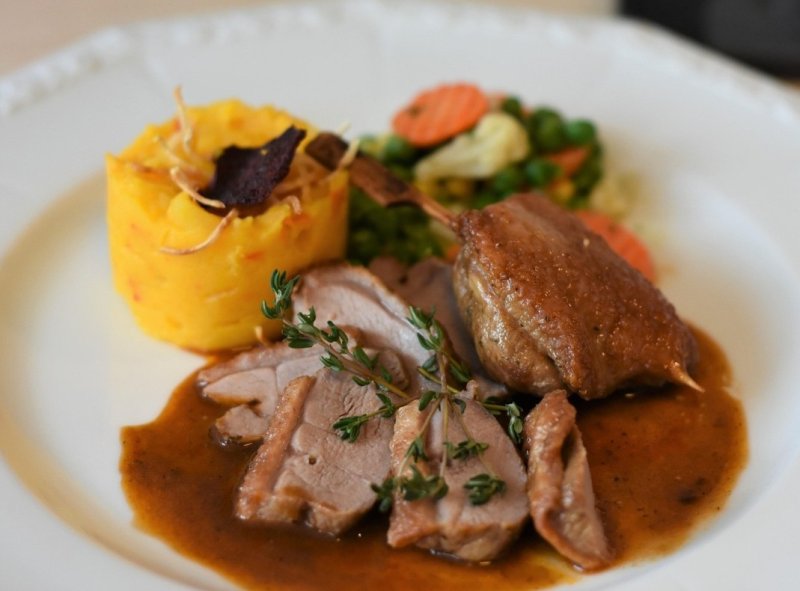 Утиная грудка – сытная и ароматная птица. Натерите ее солью, перцем, паприкой и травами. Жарьте на сковороде шкуркой вниз до золотистой корочки (чтобы вытопить жир), затем отправьте грудку в духовку при 190 °C на 10–12 минут до розовой сердцевины. Для соуса смешайте апельсиновый сок, бальзамик, мед и перец, уварите до загустения. Нарежьте утку ломтиками и полейте соусом.