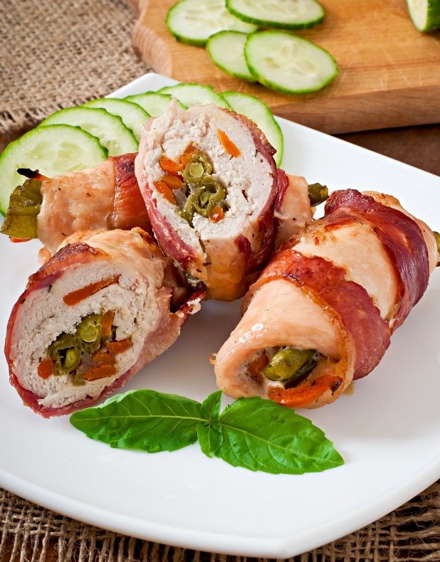 Куриный рулет с беконом и грибами – сытное и простое блюдо. Разрежьте куриную грудку "карманом" и отбейте. Приправьте солью, перцем, травами, на середину положите обжаренные грибы с луком и ломтики сыра. Заверните рулетом, обмотайте беконом и запекайте при 200 °C 30–35 минут до румяной корочки. Нарежьте рулет ломтями – внутри он останется сочным.